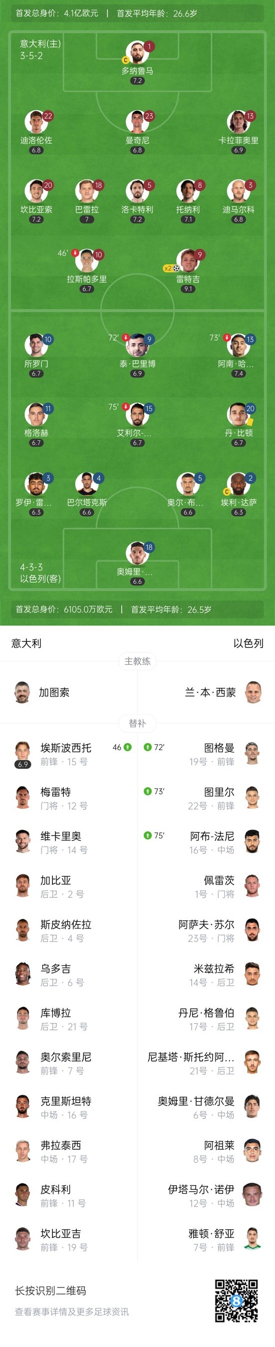 第74分钟,意大利扩大比分!雷特吉前场断球后左路弧顶一脚远射破门,意大利2-0以色列。↓